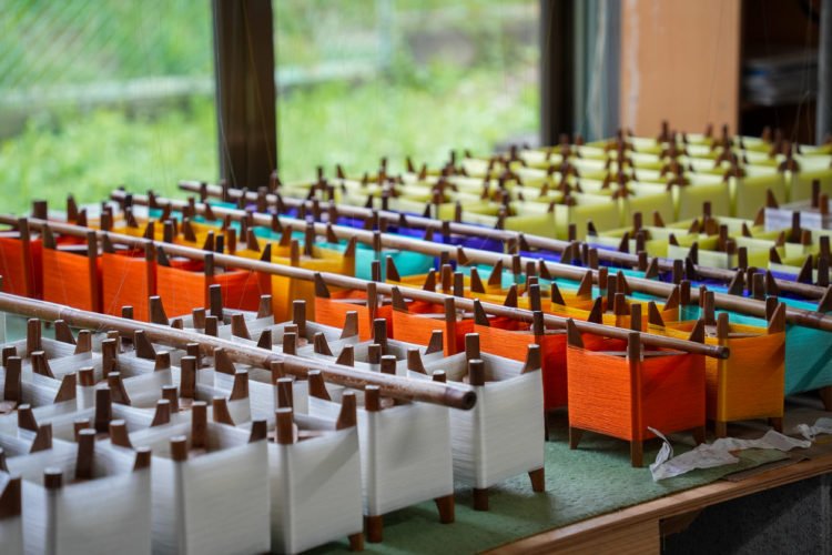 After the lecture, tour the workshop which is not open to the public, and see the design and weaving processes. In the design studio, learn in detail how patterns are made and colors are picked. In the weaving space, see how the world’s highest quality silk yarns from BRATAC are prepared for weaving, and observe the processes of yarn reeling, warping, and setting. Finally, observe the Jacquard looms in action weaving Hakata-ori.