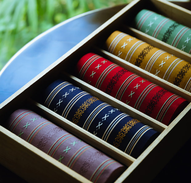 Hakata-ori has a long history that dates back to the Kamakura period (1185-1333) when Hakata merchants ventured out to Song Dynasty China and brought back textile weaving techniques. Adding their own designs to these techniques, the unique style of Hakata-ori was born. During the Edo period (1603-1868), Hakata-ori textiles were presented as valuable offerings to the Tokugawa Shogunate. The quintessential patterns woven into Hakata-ori, called kenjo-gara or “offering patterns”, feature geometric motifs of Buddhist altar objects. During the Edo period, Hakata-ori was typically worn by samurai who praised the fabric’s sturdiness and comfort.