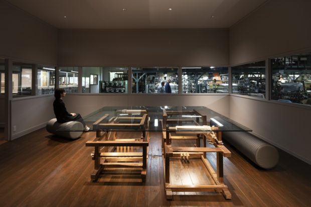 This program starts at ORIBA, a gallery and store located at the entrance of Nishimura Orimono’s main factory. ORIBA was completed and opened in 2024 as a place where visitors can view the factory through glass walls, based on the concept of being “the closest place to the workshop where one can experience the future possibilities of textiles.” This area allows visitors to connect with textiles and feel the potential of Hakata-ori beyond its traditional uses. Listen to an explanation about Hakata-ori and Nishimura Orimono here before entering the workshop.