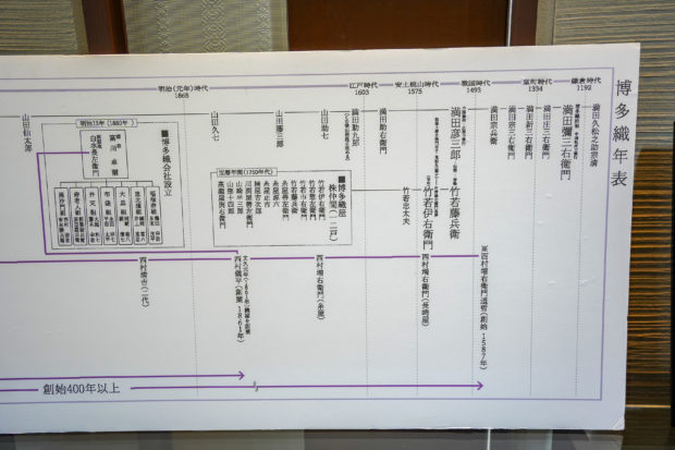 In 1587, ancestors of the Nishimura family moved from Nagasaki to Hakata and started a silk yarn import business. Later, in 1861 at the end of the Edo period, Gihei Nishimura transitioned the business to a Hakata-ori weaving factory and became the founder of Nishimura Orimono. Nishimura Orimmono continues to operate in the present day.