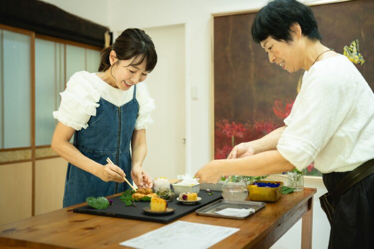 On this program, you will visit Karinsha in the bucolic Sano district of Bungotakada. Under the guidance of Miwa Anan, an ikebana master whose various activities all revolve around flowers, you will try your hand at creating an art plate. On a large plate, you will arrange pre-prepared rice and side dishes, edible flowers and herbs gathered during a stroll around the atelier grounds, and other natural materials. At the end of the session, you can savor the work you created as the true essence of this experience lies in “eating your art plate to complete the cycle.”