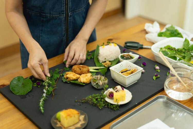 You will arrange rice and side dishes on a large plate and decorate it with edible flowers, grasses, and other natural materials. Once you finish your creation, you can savor the fruits of your labor. After a brief explanation from Ms. Anan, you will head outside to gather flowers and plants. Anything is fair game—edible flowers, herbs, medicinal plants, wild flowers and plants, and even branches and stones. Stepping outside with Ms. Anan, you will be amazed at how everything suddenly looks like potential material for your art plate. You will never run out of things to talk about with Ms. Anan, from the properties and uses of each plant to unexpected anecdotes. You will find yourself thinking “This one’s cute” or “Maybe this would work too,” and the delightful time you spend chatting while picking plants will take you back to the simple joy of childhood. Experience the healing power of the quiet nature-rich environment. Once you have gathered your ingredients and materials, you will arrange them on plates alongside rice and side dishes prepared by Ms. Anan, who will provide expert tips on arrangement and color combinations. As you start to arrange your materials, ideas will come to mind, and before you realize it, you will be lost in the moment. Each plate becomes a unique world of your own creation. Once finished, you can enjoy giving your work a theme and showing it to the other guests, which makes your plate feel more like a work of art, deepening your connection to it. At the end of the session, you can savor the work you created as the true essence of this experience lies in “eating your art plate to complete the cycle.”